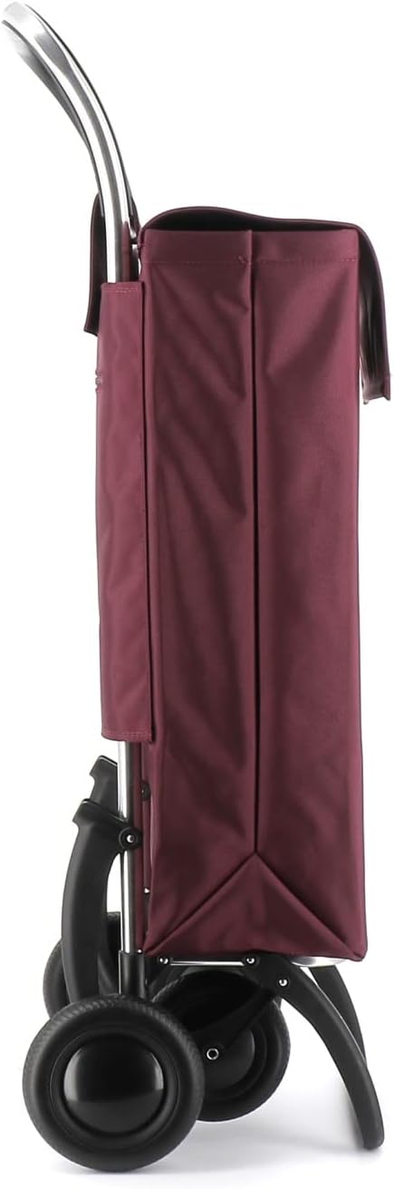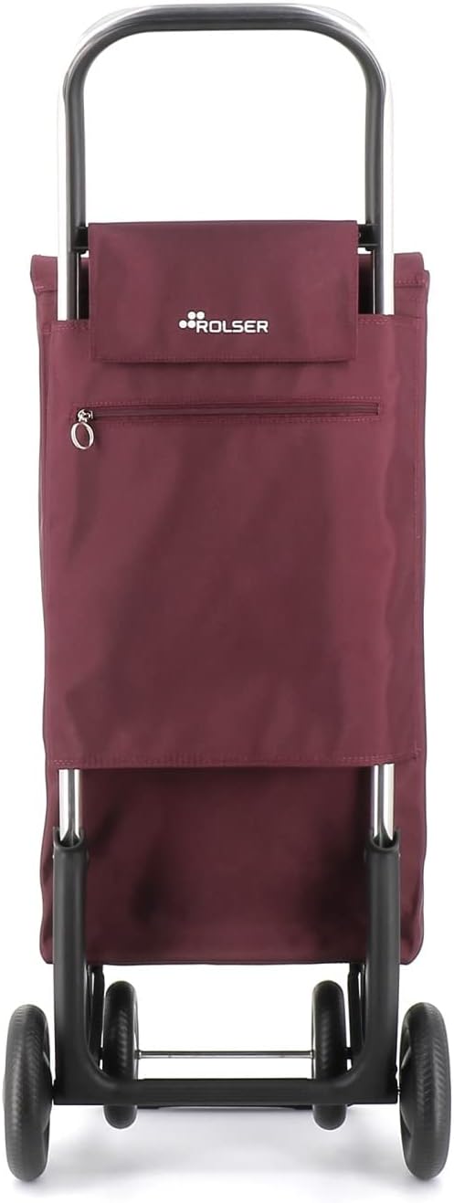 El carro Rolser de aluminio en color burdeos está diseñado para evitar que el usuario cargue con el peso de su compra o pequeñas cargas. Su sistema convertible permite utilizarlo en posición de dos ruedas para llevarlo detrás cuando está vacío, y en cuatro ruedas para empujarlo cómodamente delante cuando está lleno.