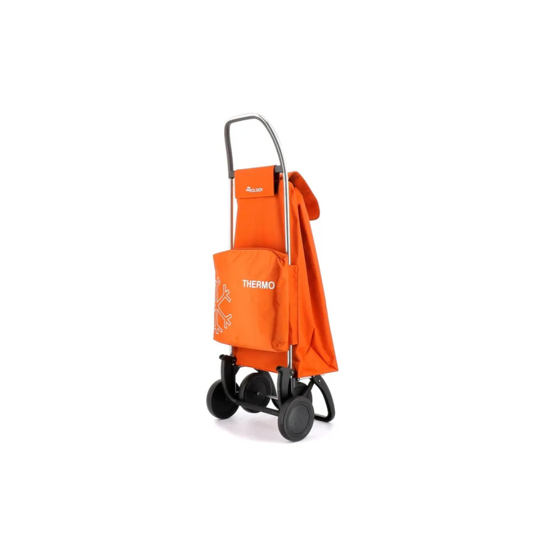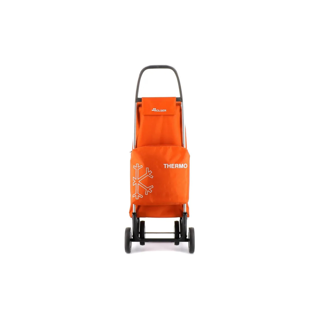 Carro Imax Termo Zen 4L Mandarina con base abatible, apoyo delantero y bolsa térmica de 4 litros. Sistema de 2 y 4 ruedas para facilitar su transporte, plegado compacto y gran capacidad con carga máxima de 40 kg.