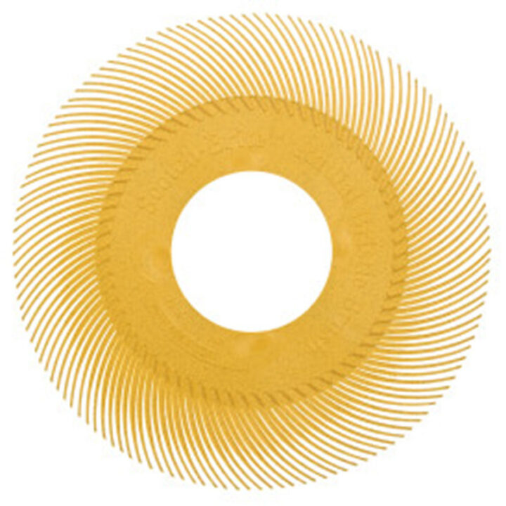 El cepillo radial Bristle Scotch-Brite™ está compuesto por una mezcla de grano abrasivo cerámico de 3M™ con óxido de aluminio y cerdas moldeadas y flexibles que permiten un mayor contacto con la superficie que los cepillos metálicos. Estos cepillos conservan sus propiedades abrasivas durante toda su vida útil. Las cerdas están moldeadas y rellenas de abrasivo permitiendo realizar labores con mayor eficacia que los cepillos metálicos. Así como unos acabados uniformens en ranuras patrones y otras áreas de difícil acceso.