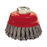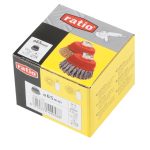 El cepillo taza de RATIO de 65 mm de diámetro está confeccionado con alambre trenzado de acero templado, cuenta con púas de 0,35 mm e incluye casquillo roscado M14.