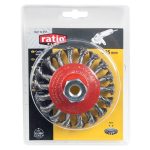 El cepillo cónico de RATIO de 95 mm está confeccionado con alambre trenzado de acero templado. Cuenta con púas de 0,50 mm e incluye casquillo roscado M14. Se presenta en un blíster.