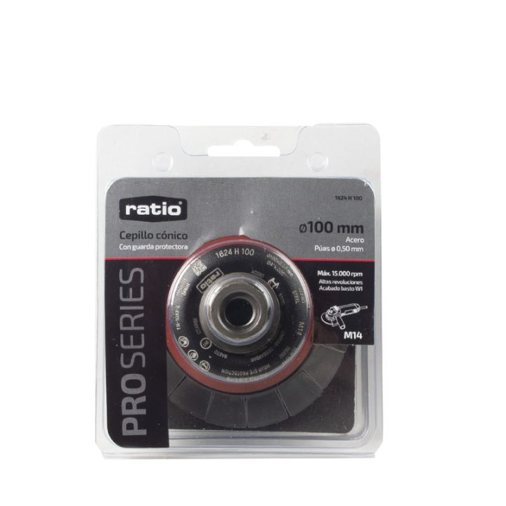 El cepillo taza cónico RATIO con guarda protectora de ø 100 mm de diámetro está confeccionado con alambre retorcido en acero latonado, cuenta con púas de 0,50 mm e incluye casquillo roscado M14. Es perfecto para cepillados continuos y frecuente: astilleros, soldadura, estructuras metálicas, etc. Gracias al diseño cónico facilita el acceso a ángulos.. Acabado basto (W1).