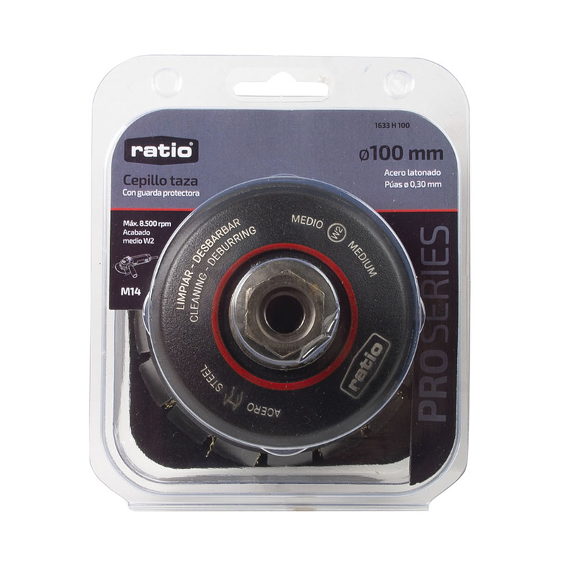 El cepillo taza RATIO con guarda protectora de ø 100 mm de diámetro está confeccionado con alambre ondulado en acero latonado, cuenta con púas de 0,30 mm e incluye casquillo roscado M14. Es perfecto para cepillados continuos y frecuentes: astilleros, soldadura, estructuras metálicas, etc. Gran capacidad de arranque Acabado medio (W2).