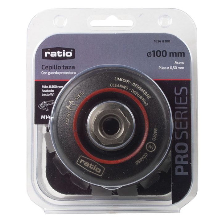 El cepillo taza de RATIO de 65 mm de diámetro está confeccionado con alambre retorcido en acero, cuenta con púas de 0,50 mm e incluye casquillo roscado M14. Es perfecto para cepillados continuos y frecuente: astilleros, soldadura, estructuras metálicas, etc. Gracias al diseño cónico facilita el acceso a ángulos. Acabado basto (W1).