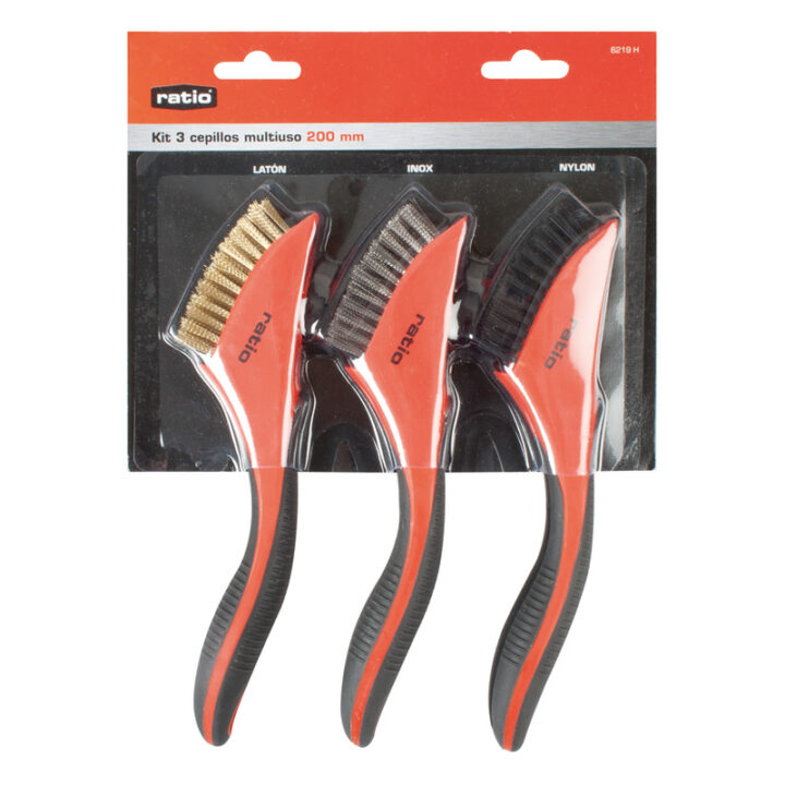 Juego de tres cepillos con púas de nilón latón y acero inoxidable. Los mangos están fabricados en bimaterial muy resistente pero a la vez ligero y suave al tacto, incluyen zonas engomadas para evitar deslizamientos. El diseño puntiagudo de los cabezales permite llegar a todos los rincones. Para limpiar, pulir, eliminar óxido o preparar superficies antes de su pintado. Se presenta en un blíster.