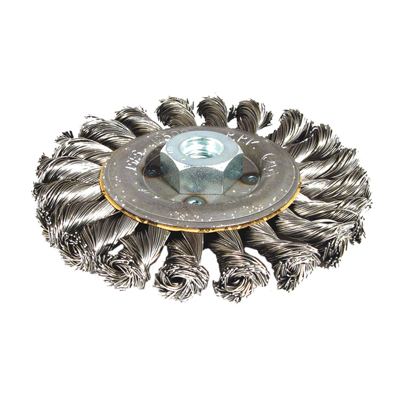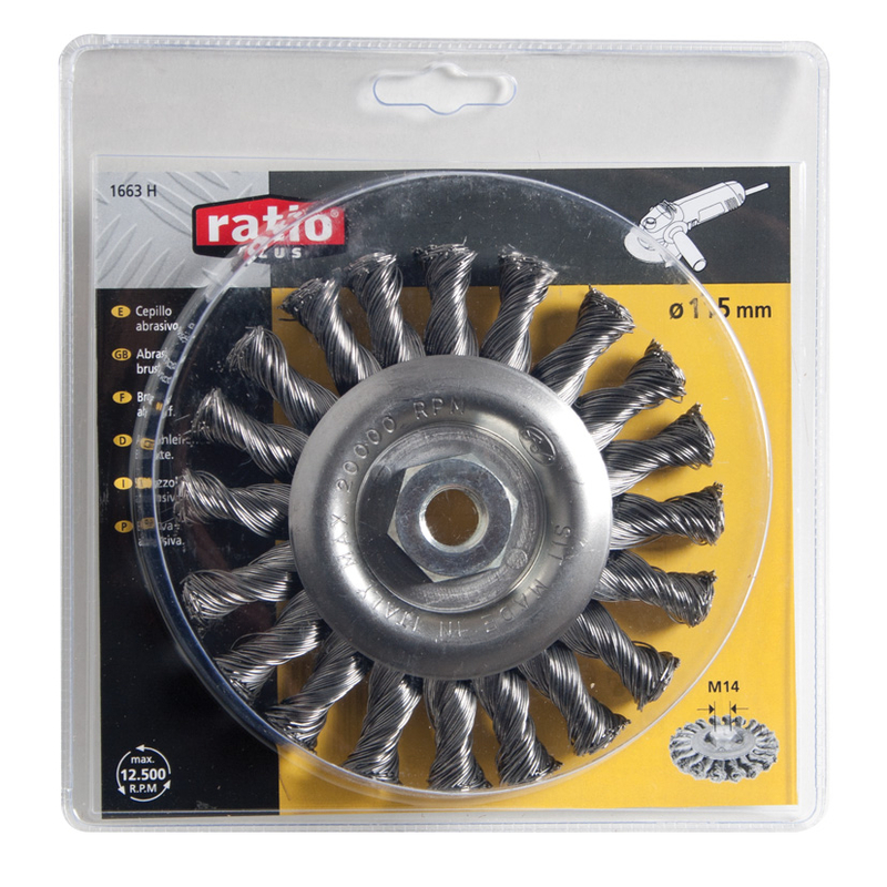 El cepillo circular de RATIO tiene un diámetro de 115 mm, está confeccionado con alambre trenzado de acero templado, cuenta con púas de 0,50 mm e incluye casquillo roscado M14.
