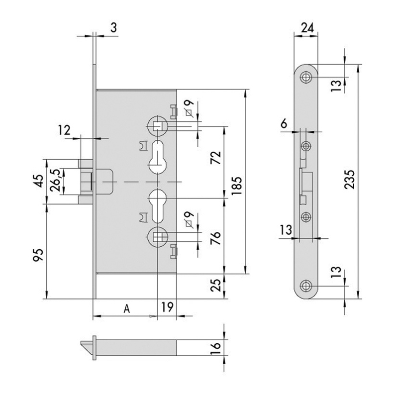 Picaporte reversible accionado por llave y manilla. La palanca tiene una longitud de 15 mm y el cuadro de la manilla de 9 mm. La caja y picaporte están fabricados en acero cincado. El Cilindro no viene incluido. Viene presentado en una caja.