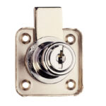 Cerradura de sobreponer para cajón con bombillo de zamak cromado y escudo embellecedor.