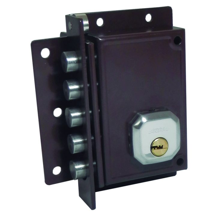 Cerradura de sobreponer de alta resistencia y robustez con cierre lateral. Dispone de cilindro redondo con 5 bulones y 5 llaves de seguridad. Sin gatillo. Está disponible en mano derecha o izquierda. Se presenta en caja.
