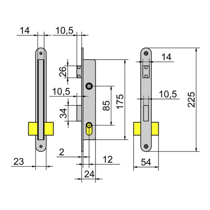 Esta cerradura cuenta con una medida del frente de 85 mm y una excéntrica de 10,50 mm, lo que hace referencia a la posición del eje de la cerradura. Está fabricada en acero inoxidable, garantizando resistencia y presenta un acabado niquelado con un frente de 24 mm. La entrada es de 12 mm, especificando la distancia desde el borde de la puerta hasta el centro del cilindro.