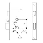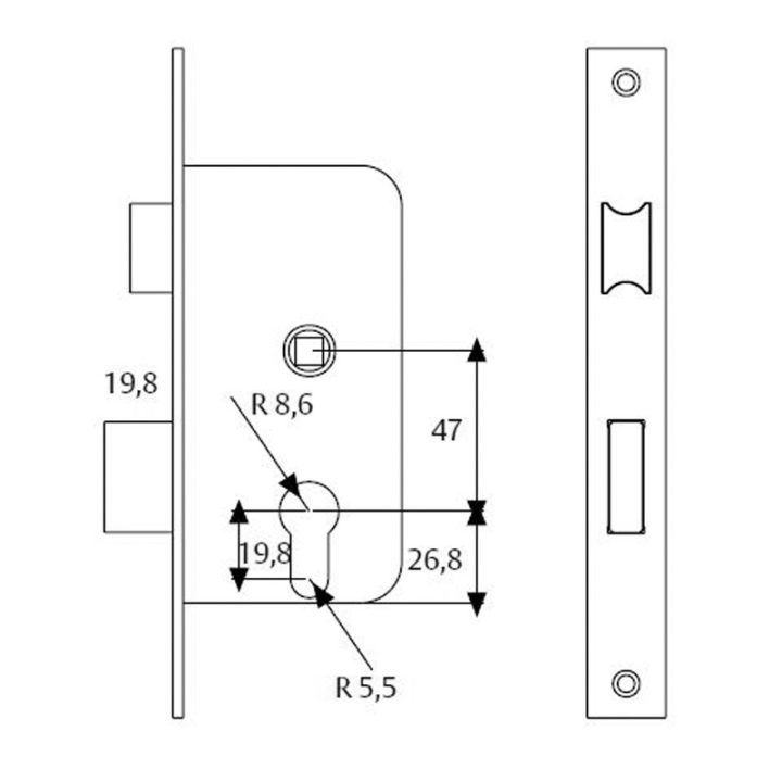 Cerradura para embutir en puerta de madera. Golpe y llave, reversible. Cilindro perfil y llave estriada.