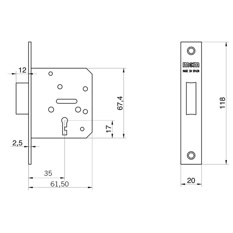 Cerradura de palanca deslizante proyectada 12 mm a 1 vuelta con apertura por ambos lados mediante una llave borja. El frente tiene un acabado latonado. Se presenta en caja.