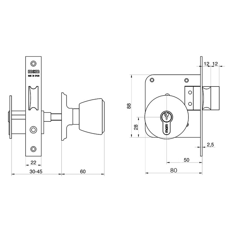 Cerradura con pomo interior reversible y llaves estriadas. El picaporte palanca están en una sola pieza.