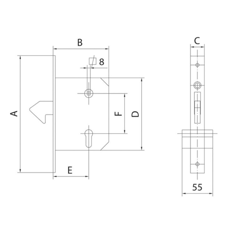 Esta cerradura gancho o cerradura pico de loro, es un herraje de seguridad para puertas correderas. Incorpora un cilindro de 55mm. Se presenta en una caja.