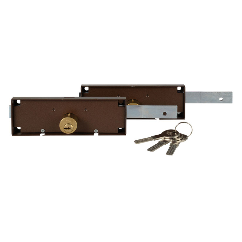 Juego de 2 unidades de cerradura para puerta con apertura lateral. Incluye 3 llaves de puntos. Se presenta en una caja.