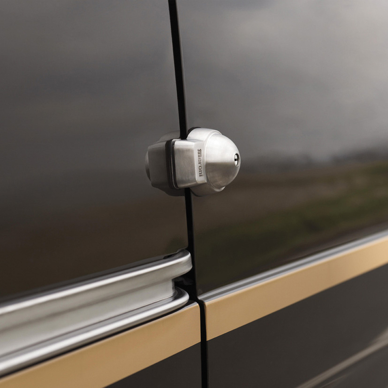 Cerradura de seguridad en acero inoxidable ultrarresistente. Para puertas batientes o laterales. Llave de seguridad plana de 15 puntos, multicombinación y reversible. Se bloquea automáticamente una vez cerrados los portones posterior o lateral. Viene presentada en una caja individual.