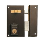 Cerradura para sobreponer con golpe y llave. Tiene cilindro forjado redondo para exterior y pera para interior. Está disponible en mano derecha e izquierda y se presenta en caja.