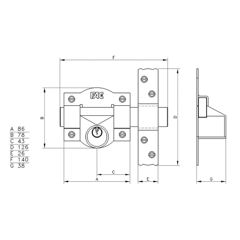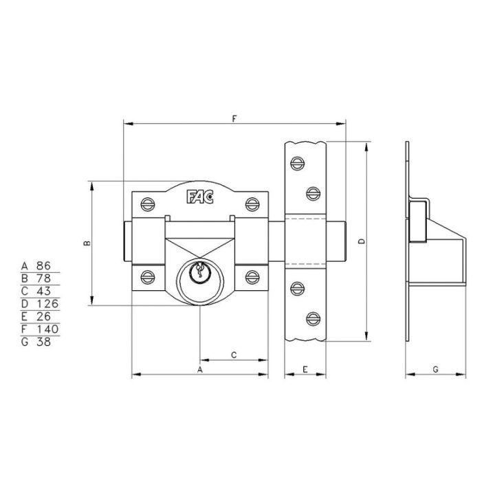 Cerrojo pintado con placa de acero de 2 mm y eje de 38mm. Se acciona con la llave únicamente por la parte interior quedando siempre la barra fija. Cerradero en acero de 3 mm.