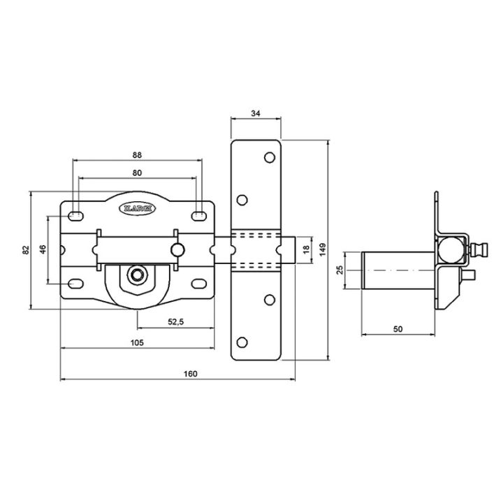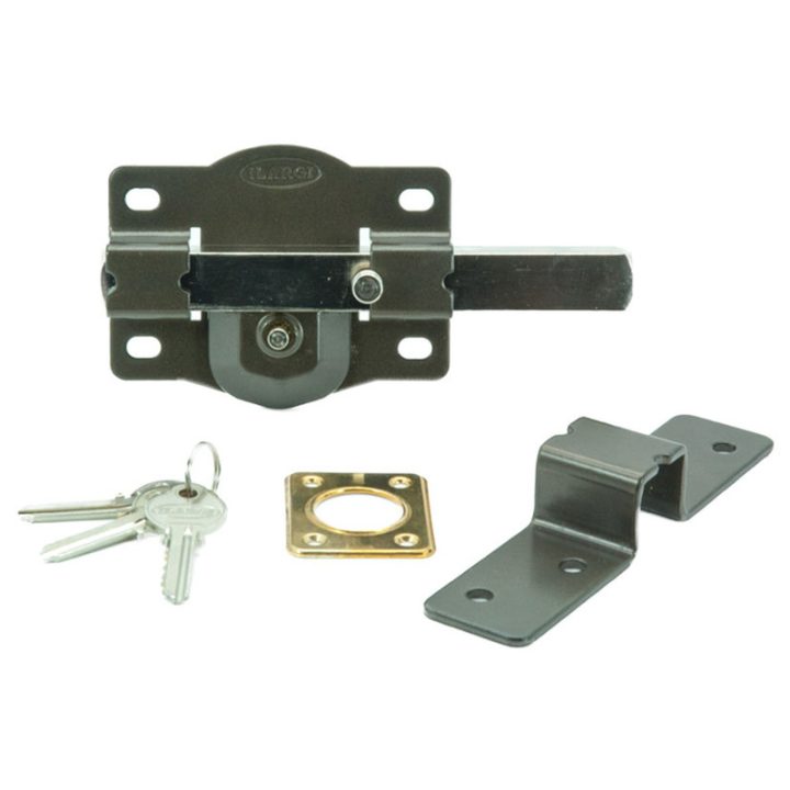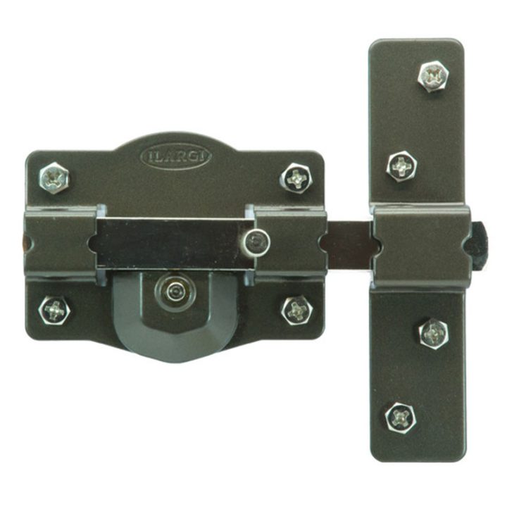 Cerrojo con cilindro exterior y botón interior. El cilindro es redondo de serreta, la placa fabricada en acero de 2mm, cerradero fabricado en acero de 3 mm y la placa de 105 mm. Tiene acabado en hierro esmaltado de alta resistencia. Incluye 3 llaves y se presenta en una caja.