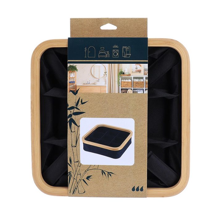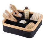 Esta cesta TENDANCE de la serie Bambú es plegable. Está fabricada en poliéster de color negro y marco en bambú. Encaja en cualquier interior y el montaje es muy sencillo. Dispone de compartimentos para facilitar el almacenaje. Es una excelente opción ecológica y duradera para poder organizar todos los accesorios que tengas en el baño. Viene presentada en un blíster y la puedes combinar con el resto de productos de la misma serie.