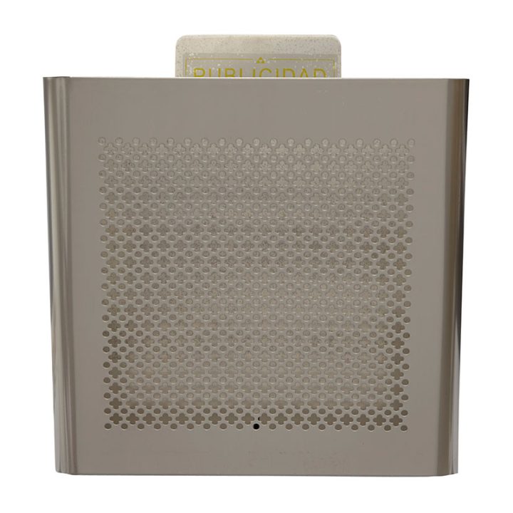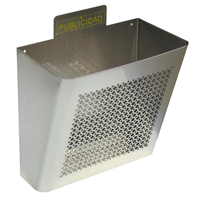 Esta cesta para publicidad con diseño curvo está fabricada en acero inoxidable. Se suele instalar en la entrada de los edificios, de esta manera evita la entrada de personas ajenas a la comunidad de vecinos. Tiene una visibilidad total del interior y sus medidas son 32x19xh.30.5 cm. Se presenta en una caja y está disponible en color plata, negro/ocre y blanco.