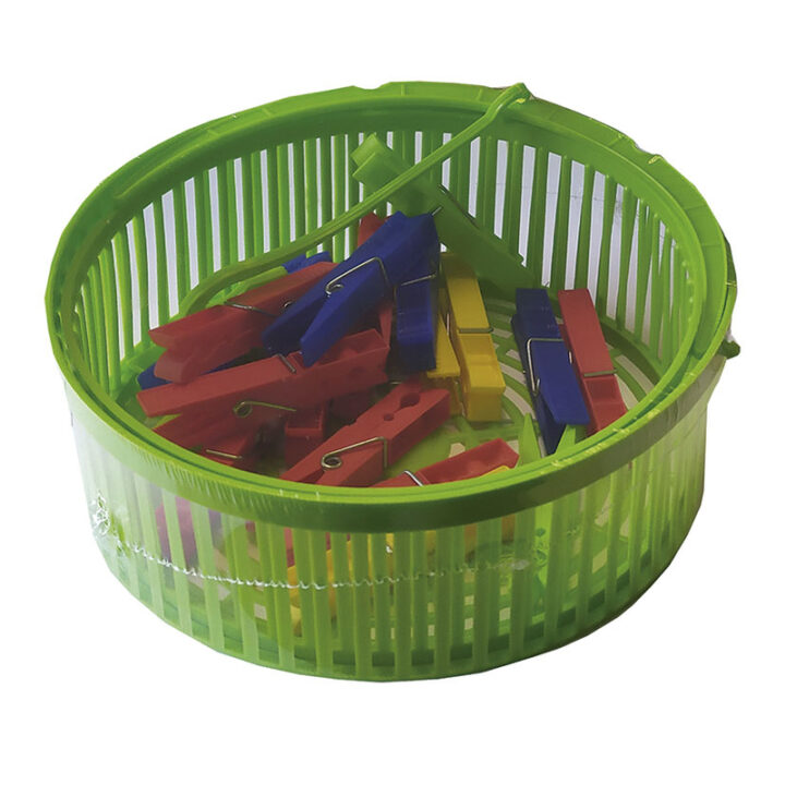 El set está formado por 25 pinzas en colores surtidos más un práctico cesto que se puede colgar. Viene presentado en bolsa.
