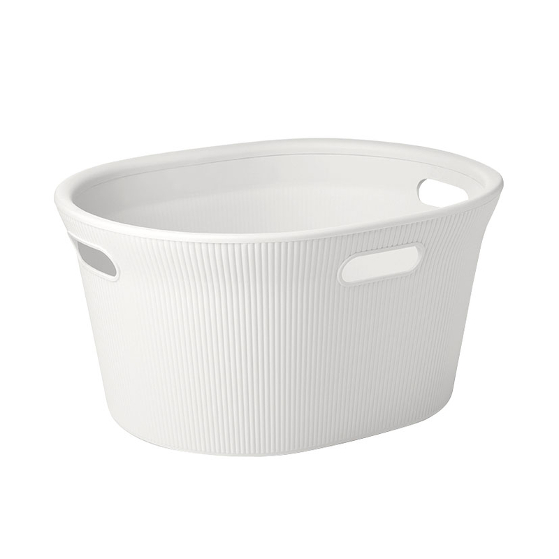 El cesto pongotodo está disponible en color blanco. Está fabricado en plástico libre de BPA y tiene una capacidad de 35 litros.