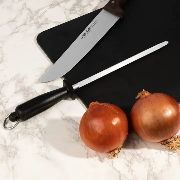 La chaira Arcos de 230 mm es una herramienta indispensable para mantener el filo de tus cuchillos en perfectas condiciones. Fabricada con acero al carbón y una vestimenta de cromo, asegura un afilado impecable y duradero sin desgastar el acero.