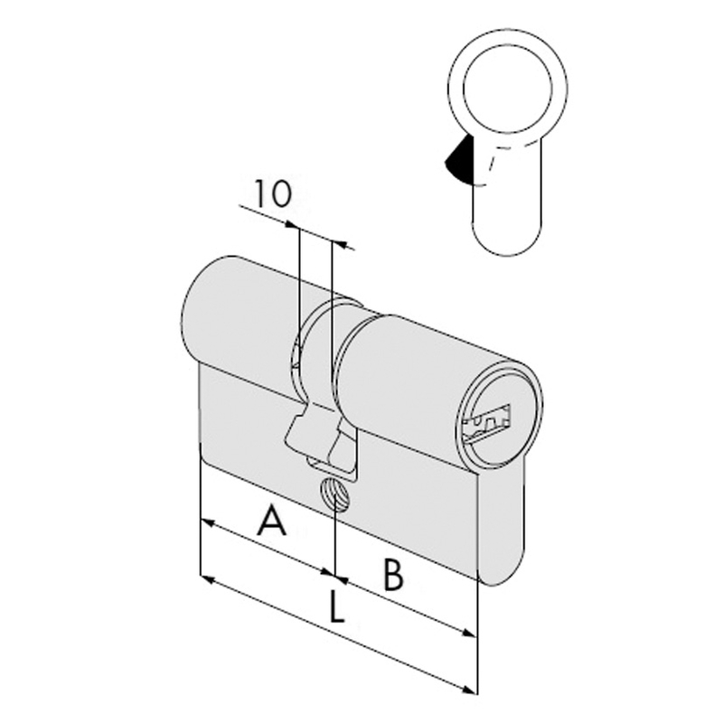 Cilindro de seguridad con excéntrica de 13,2 mm y 5 llaves reversibles en aleación especial de latón, niqueladas. Viene presentado en caja.