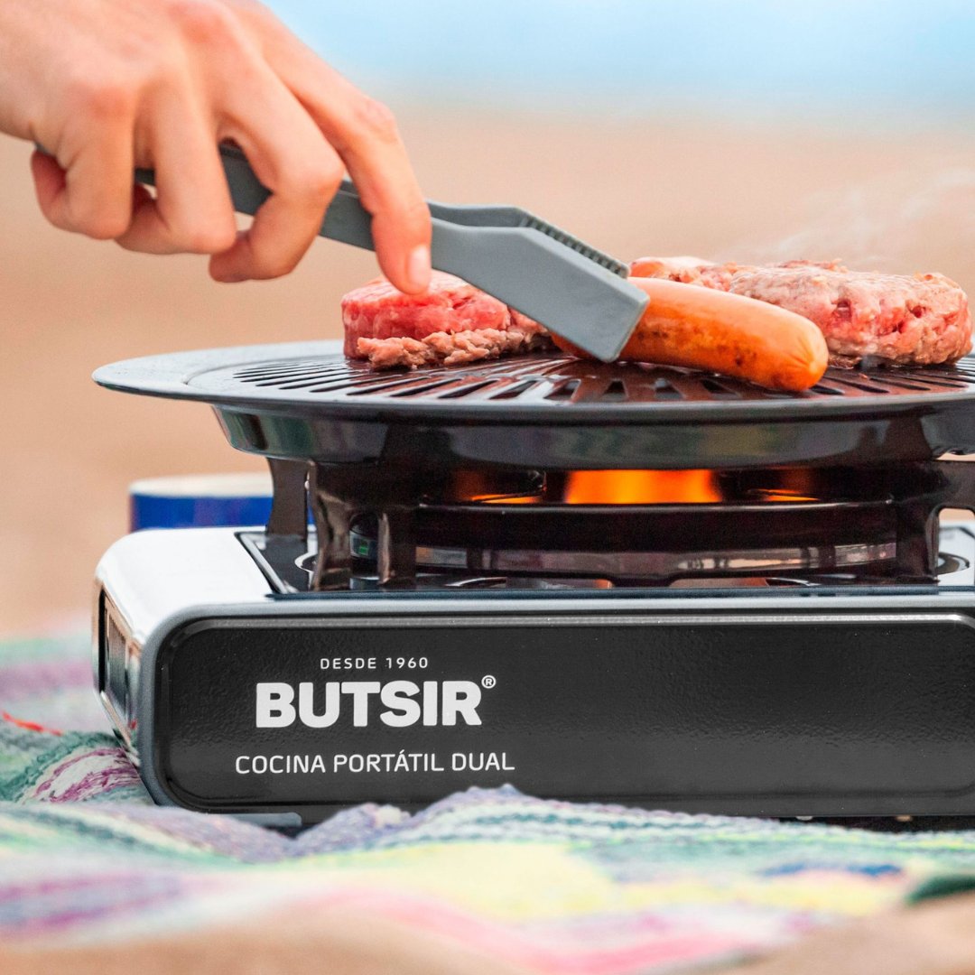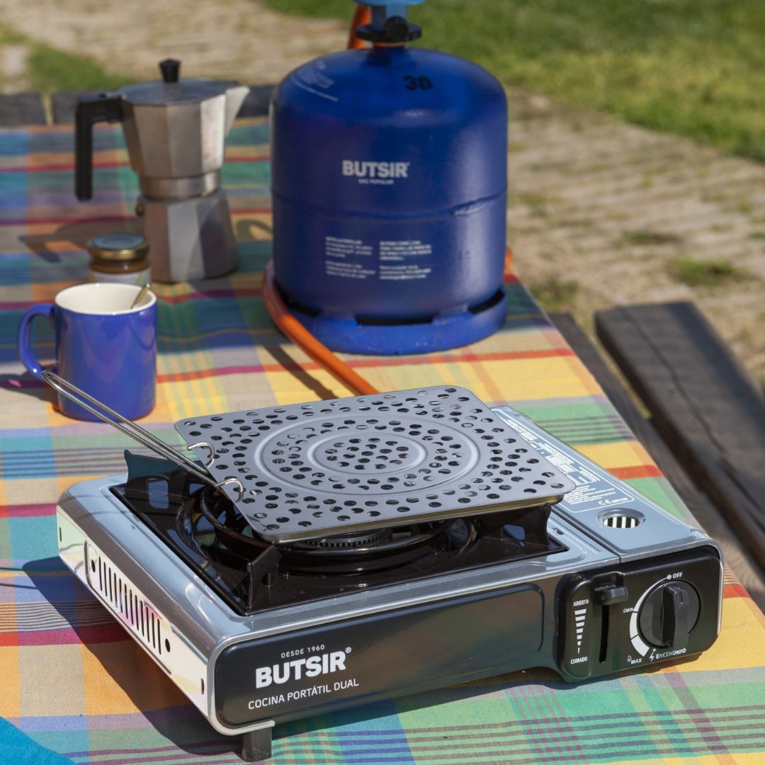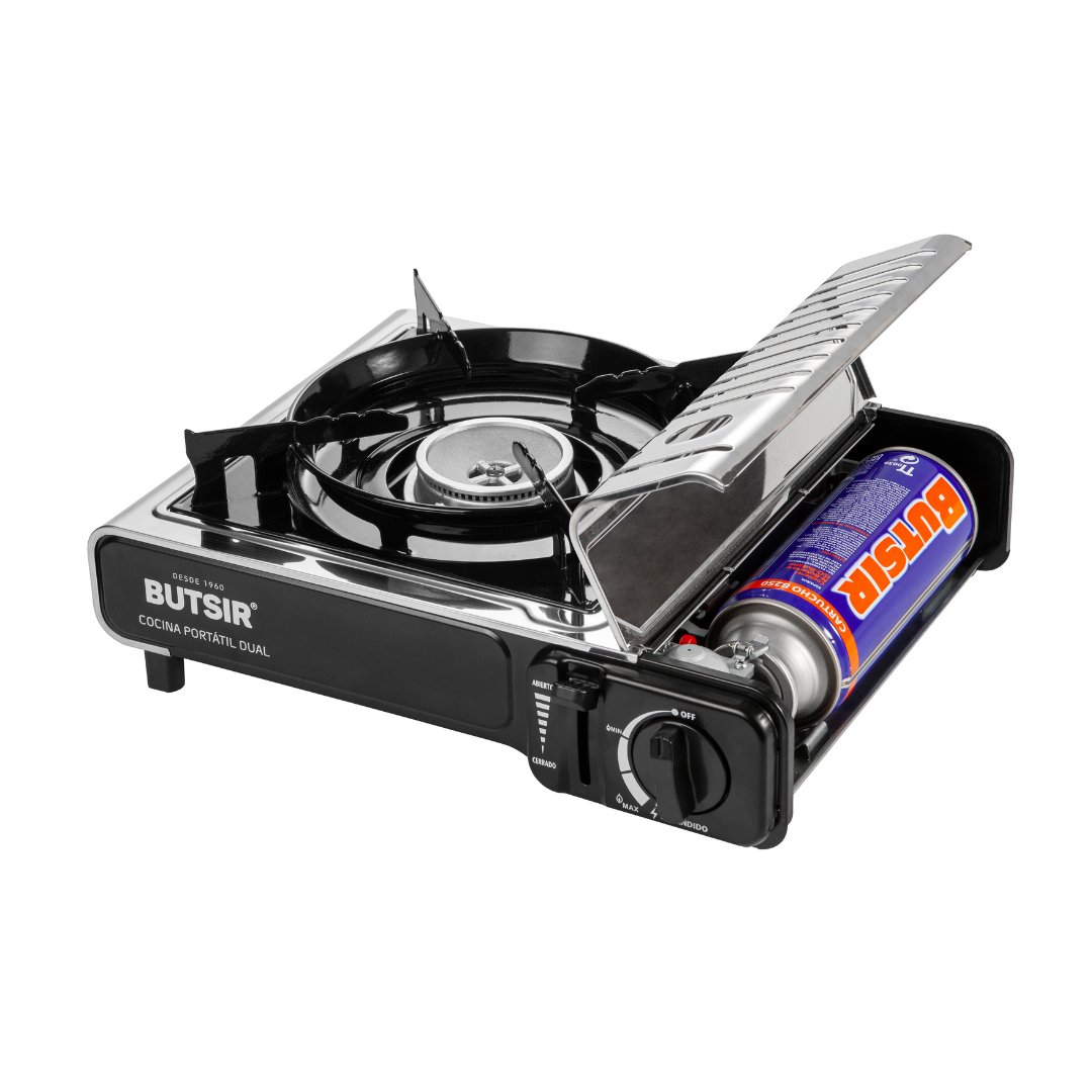 Cocina portátil a gas Butsir MS-2000 DUAL: compacta, ligera y versátil, ideal para camping, caravanas y actividades al aire libre. Funciona con cartucho B-250 o botellas de gas butano. Incluye encendido piezoeléctrico y maletín de transporte.