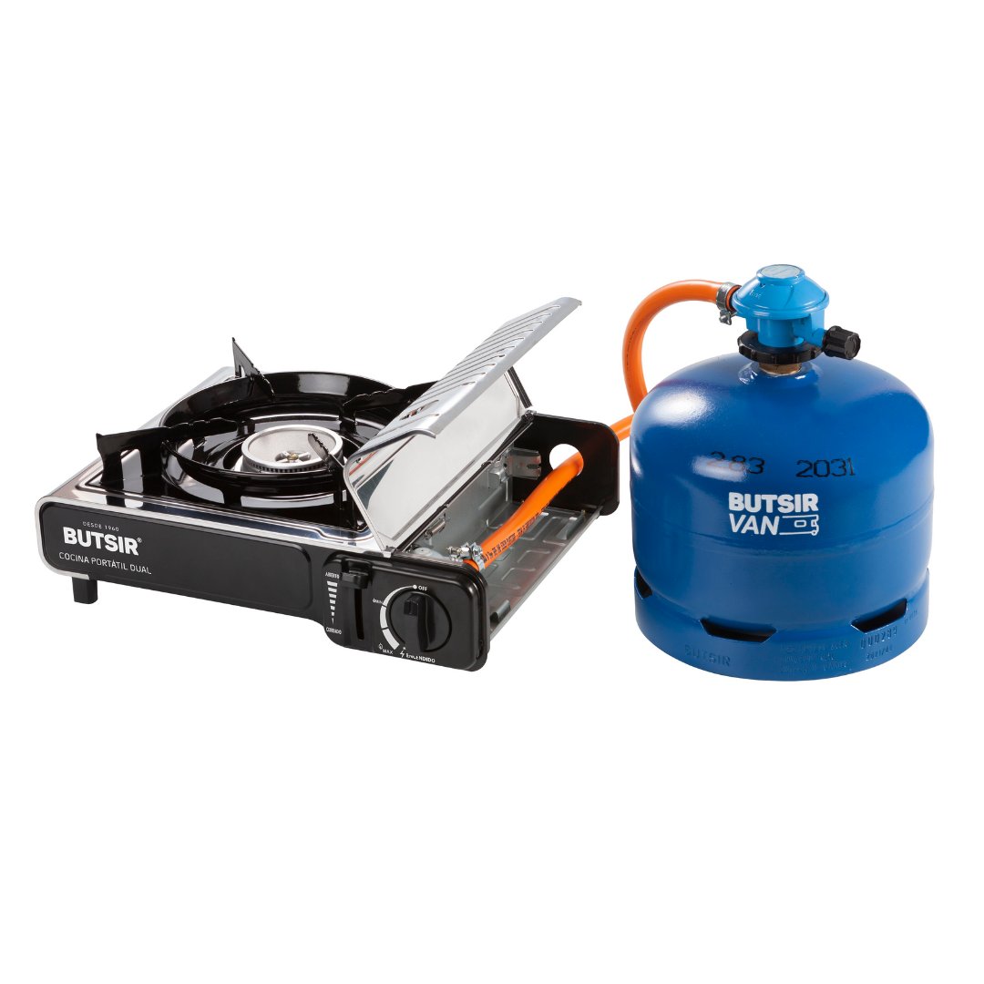 La Cocina Portátil Butsir MS-2000 DUAL es la solución perfecta para quienes buscan una cocina de gas eficiente y fácil de transportar. Diseñada para ofrecer versatilidad, esta cocina permite el uso de cartuchos B-250 y botellas de gas butano (azules o naranjas), adaptándose a diversas necesidades en camping, caravanas, pícnics o actividades al aire libre.