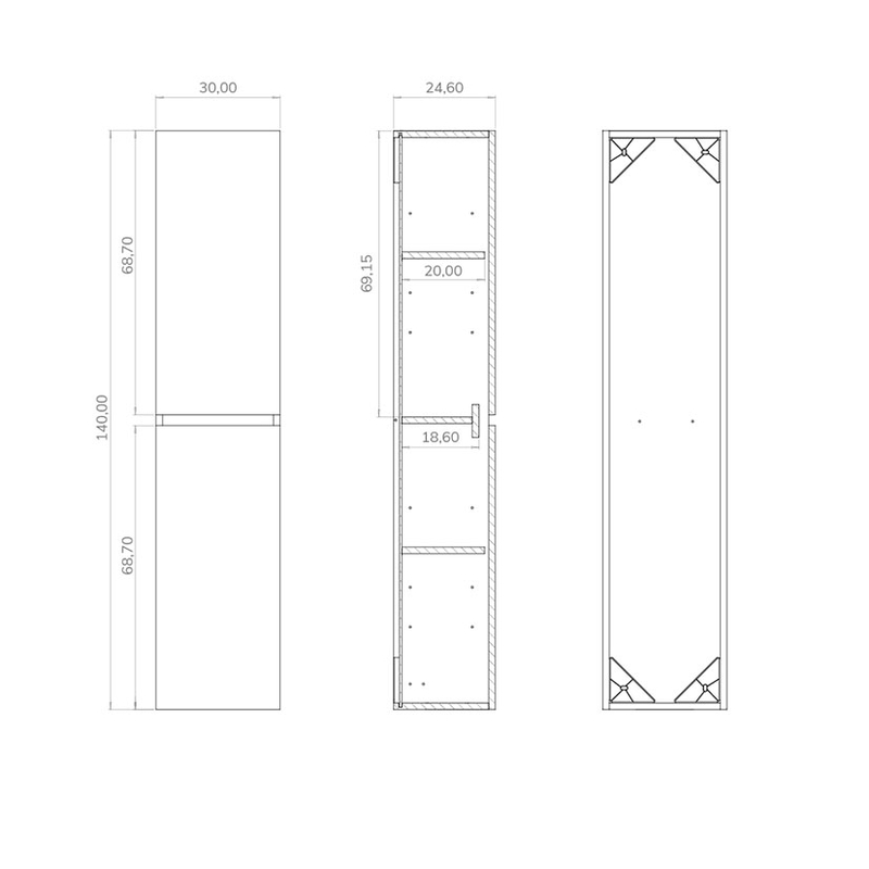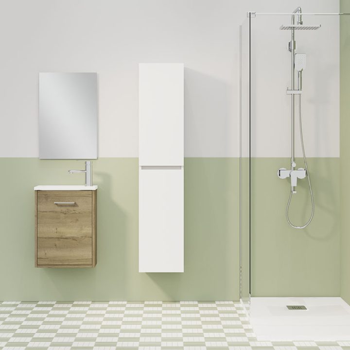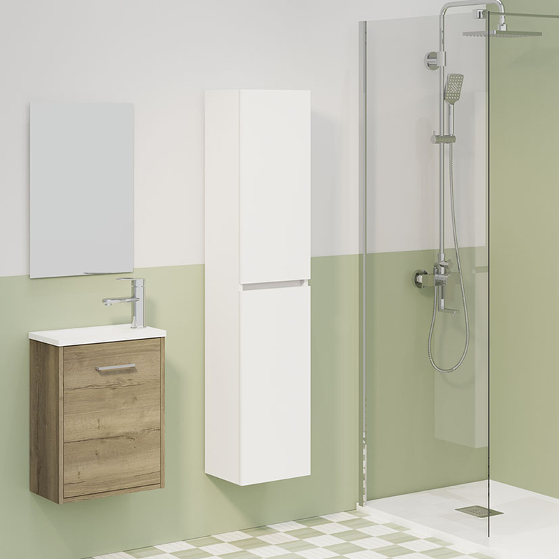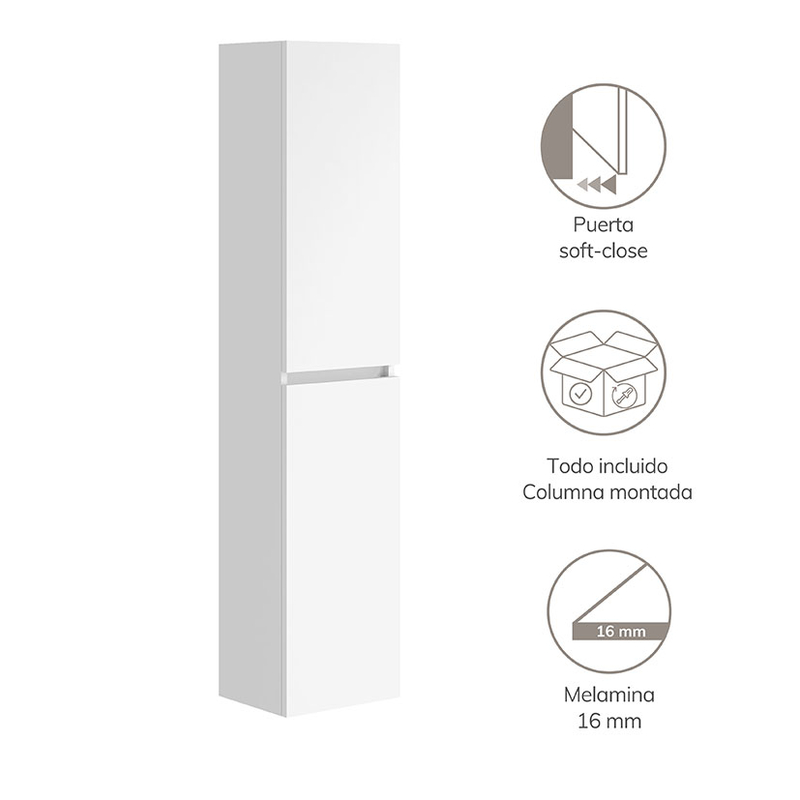Columna auxiliar para cuarto de baño u otras estancias. Dispone de apertura Soft-close, sin tiradores y cierre amortiguado. Está fabricado en melamina de 16 mm y se sirve montado de fábrica para una fácil instalación. Fabricado en España. Disponemos de más elementos combinables.