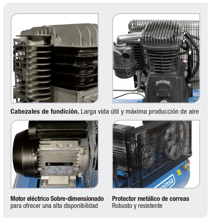 Compresor de correas Imcoinsa Serie Advance 3HP 100L. La gama de compresores ADVANCE está diseñada para ofrecer una alta producción de aire con el máximo grado de disponibilidad. Cabezales y motorización sobre-dimensionada para ofrecer el máximo rendimiento en el sector industrial, automoción, agrícola, pintura, etc.