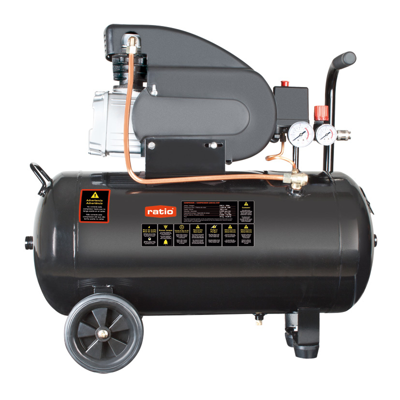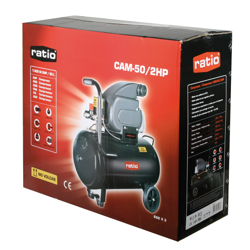 Este compresor de pistón de la serie CAM de RATIO lubricado y autoventilado, destaca por contar con cabezal de aluminio con 1 cilindro de hierro fundido, filtro de aire integrado, motor con protección térmica, así como asa y ruedas para un fácil transporte. Viene presentado en caja.