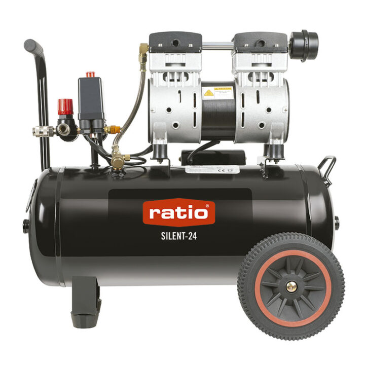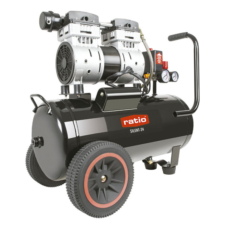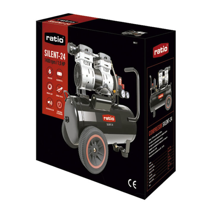 Este compresor portátil RATIO lubricado y autoventilado se puede transportar en cualquier posición ya que no necesita aceite. No requiere un mantenimiento especial viene equipado por con empuñadura y ruedas para su mejor transporte. Dispone de un motor silencioso que tiene una potencia de 1,5 HP. El calderín tiene una capacidad de 24 litros y trabaja a una presión máxima de 8 BAR. Además, tiene doble salida de aire.