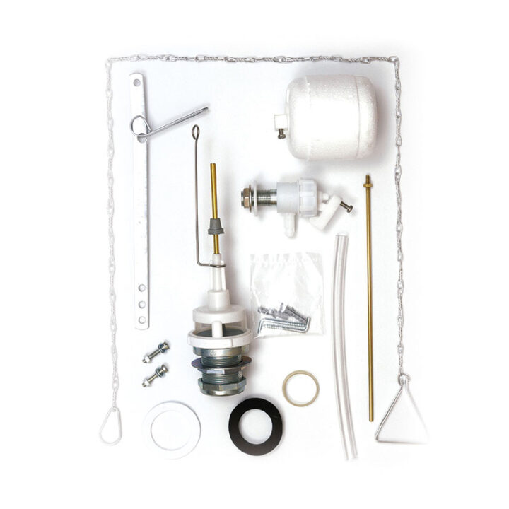 Conjunto de mecanismos completo para instalar en WC con cisterna alta de grifo lateral. Está compuesto por: un descargador con juntas un grifo de 3/8 con varilla y boya, tornillos, palanca, conjunto de cadena y tirador, tacos y escarpias. Viene presentado en una caja.