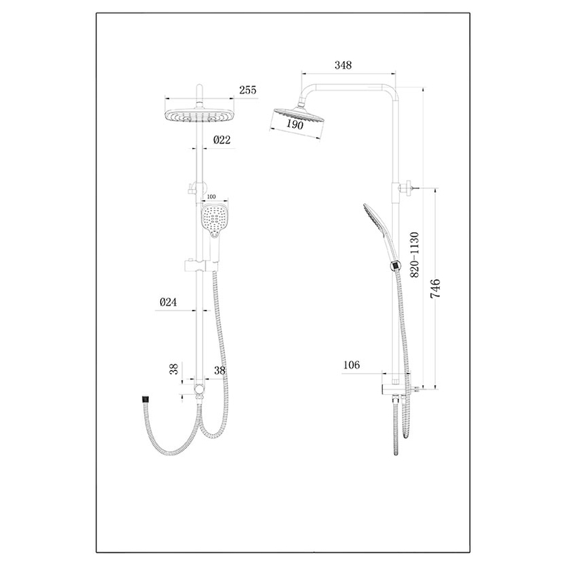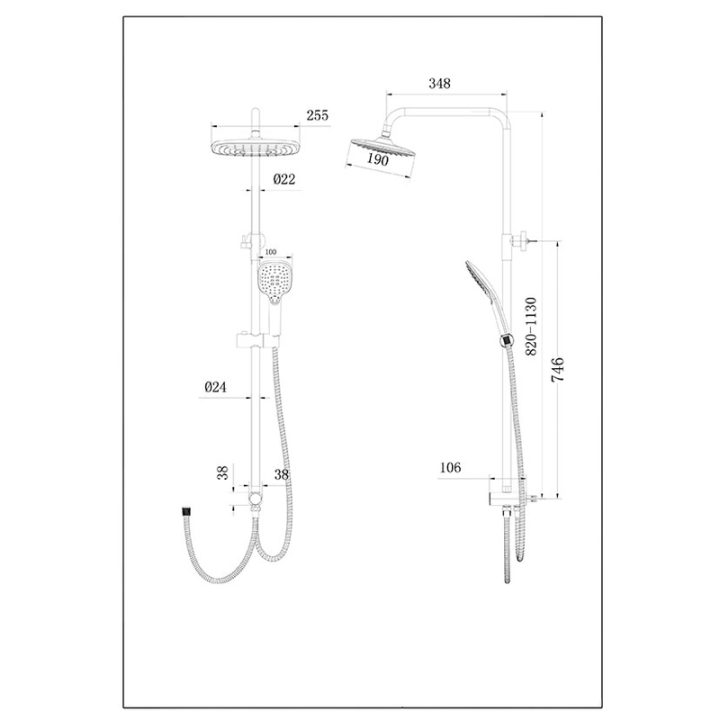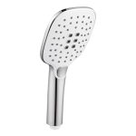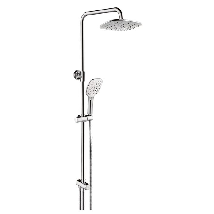 Conjunto de ducha con barra de duña universal cromada telescópica más rociador de ducha cuadrado 25,5×19 cm, más mango de 3 posiciones, más flexo cromado doble engatillado 1,70 m. Además dispone de selector de agua en plástico cromado con pulsador. Cuenta con picos en la base de silicona que facilitan la limpieza del rociador, evitando que la cal se acumule.