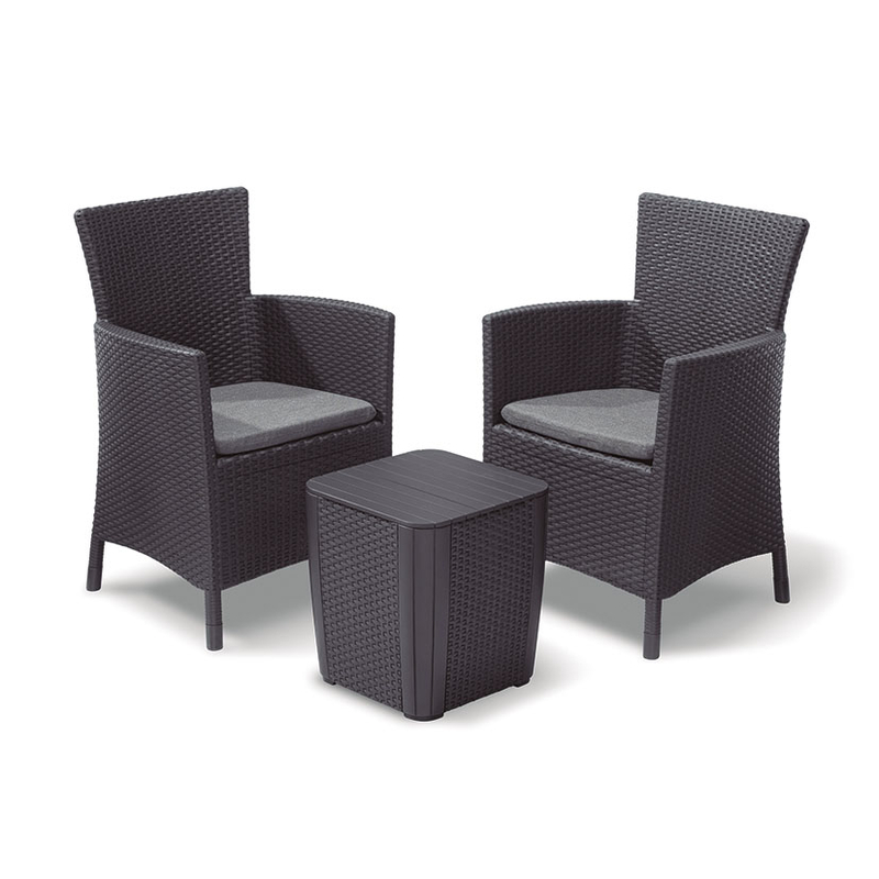 Este conjunto está fabricado en polipropileno 100% reciclado, imitación ratán plano, un material ideal y de gran resistencia a la intemperie. Su diseño es moderno y perfectamente combinable con el resto de mobiliario de jardín. Además es ideal espacios reducidos. El conjunto está formado por 2 sillones con respaldo alto y ergonómico para un mayor confort con unas medidas de 62x60xh.89 cm y una mesa/puf con efecto madera y ratán plano para almacenaje de objetos de 39x39xh.43 cm. Incluye cojines. Viene presentado en caja. Atención, este conjunto no viene montado.