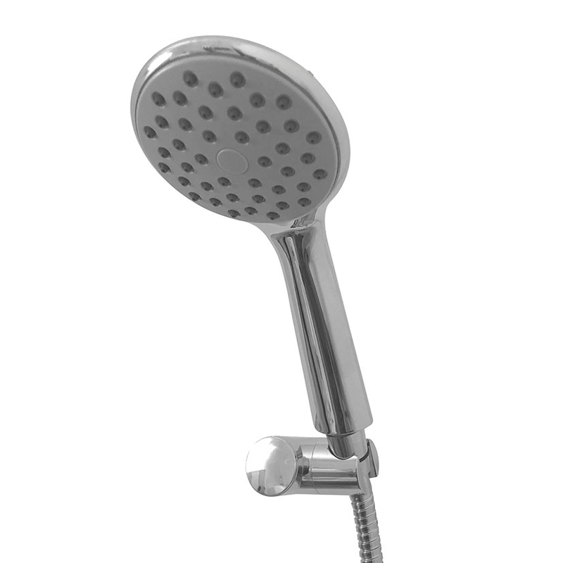 Este conjunto está compuesto por un mango de ducha, flexo y soporte cromados. El mango tiene una 1 posición y su frontal es de color gris. Tiene una altura de 1,70 cm. Viene presentado en un blíster.