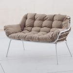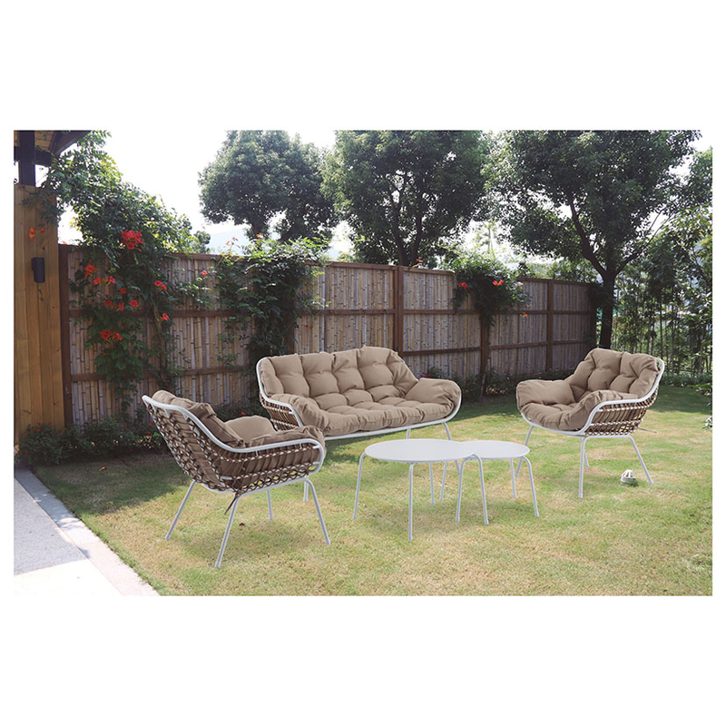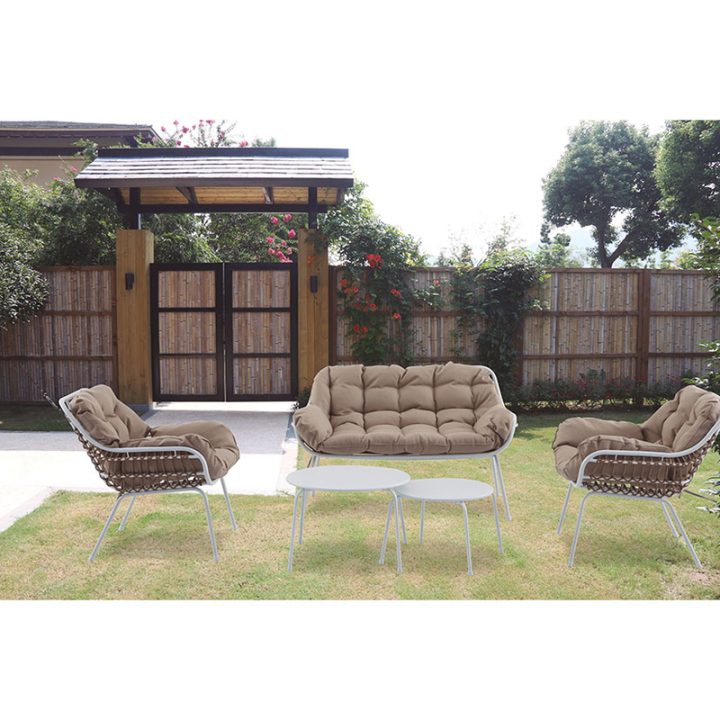 Este conjunto está formado por una estructura metálica lacada en blanco y ratán sintético de gran resistencia a la intemperie. Es moderno y de gran comodidad para colocarlo en tu lugar favorito y poder disfrutar del tiempo libre. Este conjunto está compuesto 1 sofá de 2 plazas de 74x125xh.77 cm, 2 sillones individuales de 74x71xh.77 xm y 2 mesitas con superficie en acero de medidas: ø 60xh.40 cm y ø 48xh.35 cm. Los cojines de color beige/marrón claro están fabricados en poliéster 250 gr, material idóneo para exteriores. Viene presentado en caja. Atención, este conjunto no viene montado