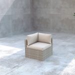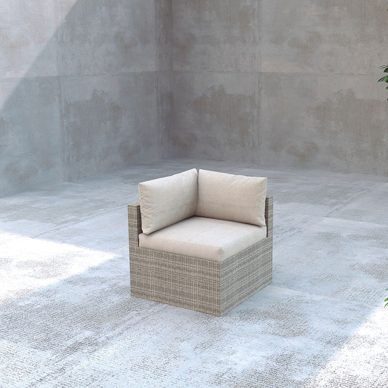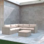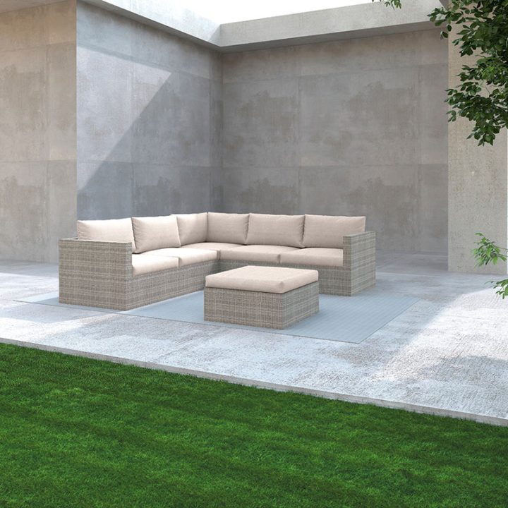 Este conjunto está compuesto por una estructura metálica y ratán sintético plano, ideal y de gran resistencia a la intemperie. Es elegante y de gran comodidad para colocarlo en tu rincón favorito y poder hacer un lugar especial para disfrutar del tiempo libre. Este conjunto está compuesto por 2 sofás dobles de dimensiones 135x72xh.64 cm, 1 rinconera de 72x72xh.64 cm y 1 puf 64x64xh35 cm. El puf también puede ser utilizado como una mesa. Los cojines están fabricados en poliéster, material idóneo para exteriores. Viene presentado en cajas y se sirve en 2 embalajes. Atención, este conjunto no viene montado