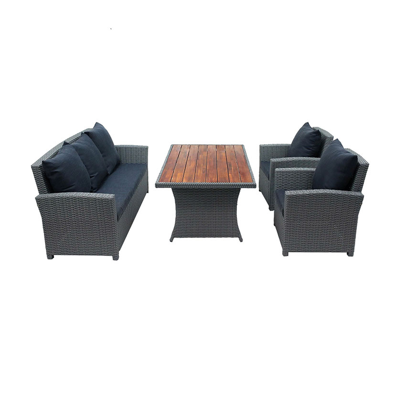 El Conjunto de Jardín Lake combina materiales resistentes y un diseño moderno que se adapta a cualquier espacio exterior. Ideal para reuniones al aire libre o momentos de relajación en familia. Tiene la estructura en acero galvanizado recubierta con ratán sintético en color gris, la mesa tiene un acabado natural gracias a su sobre que está elaborado con lamas rectas de acacia, aporta calidez y un toque elegante. Los cojines del asiento y el respaldo son desenfundables y están elaborados en 100% poliéster de 230 g/m2 en color negro. El conjunto se compone de un sofá de dimensiones de 173x74xh.82 cm, 2 sillones de dimensiones 75x75xh.82 cm y una mesa de 136×83,5xh.65,5 cm.