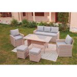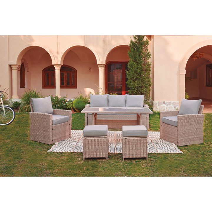 Este conjunto viene compuesto por una estructura metálica y tejido de ratán sintético plano, ideal para exteriores gracias a su gran resistencia a la intemperie. Dispone de un diseño elegante y de gran comodidad, donde lo coloques hará de el, un espacio especial para disfrutar del tiempo libre. Este conjunto está compuesto por 1 sofá de 3 plazas de dimensiones 177x72xh.80 cm, 2 sillones de 67x72xh.80cm, 2 taburetes de 40x40xh.44 cm y mesa alta con superficie en cristal templado de dimensiones 1405x80xh.70. Los cojines están fabricados en un material idóneo para exteriores. Atención, este conjunto no viene montado y se sirve en 2 cajas.