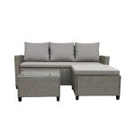 Este conjunto es perfecto para compartir momentos especiales con familia y amigos. Está compuesto por una estructura metálica y ratán sintético plano en color gris, ideal y de gran resistencia a la intemperie. Está compuesto por 1 sofá triple de dimensiones 177x76xh.82 cm, 1 reposapiés 70x70xh39 cm y una mesa con la superficie de vidrio transparente 63x63xh.39 cm. Los cojines desenfundables están fabricados en 100% poliéster y espuma 100% poliuretano, material idóneo para exteriores. Un cojín de medidas 159x55xh.8 cm y 3 cojines de respaldo de 57x51xh.21 cm. Viene presentado en caja. Atención, este conjunto no viene montado