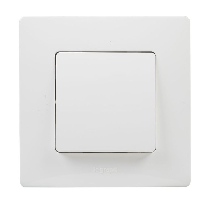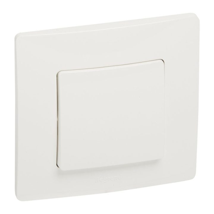 Conmutador de empotrar en color blanco. El mecanismo de la serie Niloé ayuda a reducir el impacto medioambiental durante el ciclo de vida del producto.