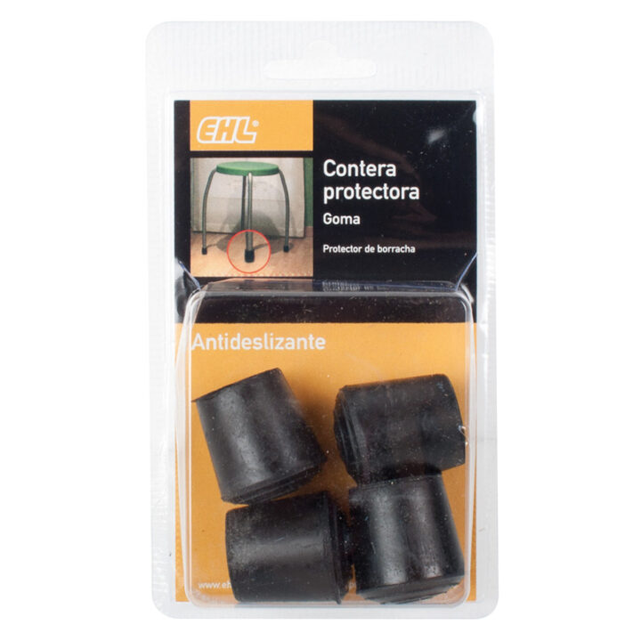 Esta contera redonda está fabricada en goma de color negro, indicada para el exterior. Se presenta en un blíster y la cantidad del envase puede variar en función de las dimensiones del producto.