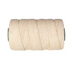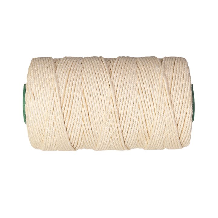 Cuerda de algodón trenzado de color blanco. Es suave al tacto y tiene buena capacidad de agarre, además los nudos no se deshacen. Se presenta en bobina de 25 metros de longitud y 8 mm de diámetro.