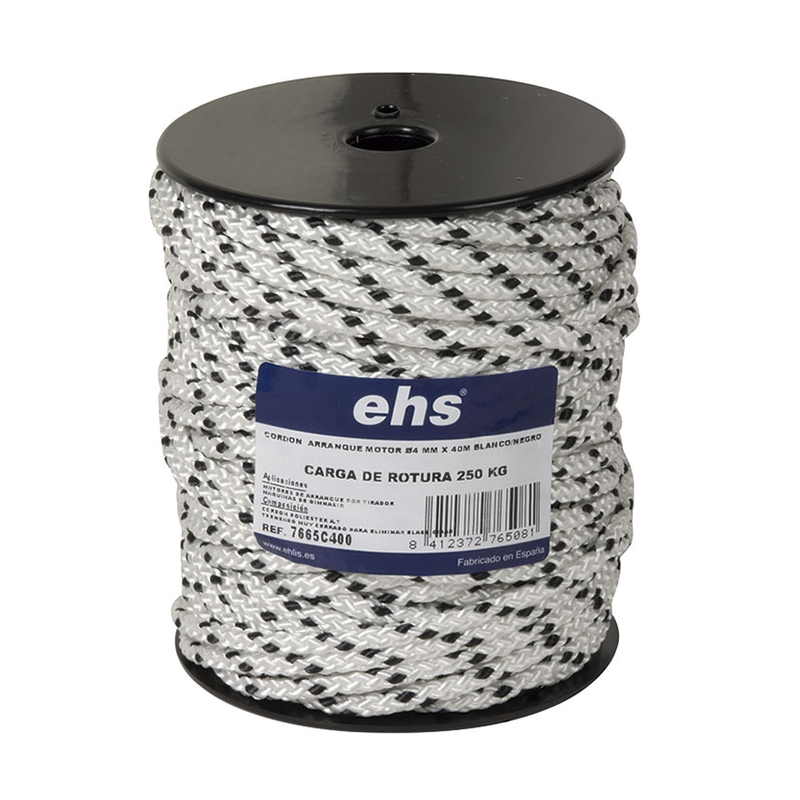 Cuerda trenzada de alta tenecidad fabricada en poliéster en color blanco y negro. Tiene un tratamiento anti-UV que evitará su deterioro causado por los rayos solares. Se presenta en una bobina y el diámetro puede variar en función del metraje de la cuerda.