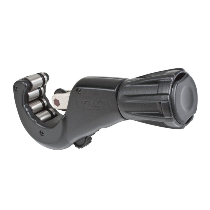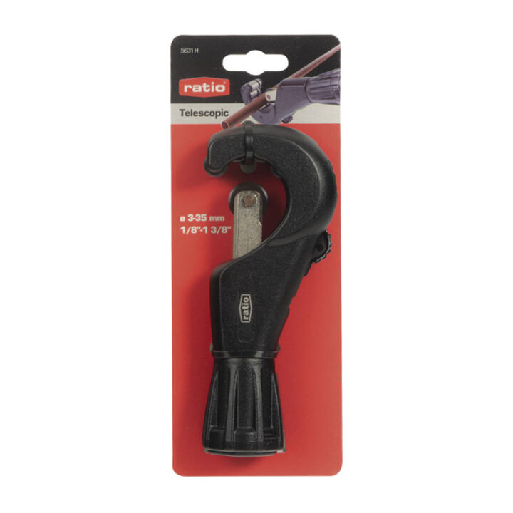 Cortatubos profesional RATIO 5631.Diseñado y fabricado especialmente para cortes fáciles y rápidos en diferentes materiales. Este cortatubos profesional es una herramienta básica para realizar cortes limpios, precisos y seguros en tubos de diferentes materiales. Dispone de: cuchilla telescópica; cuchilla escariadora retráctil. rulina de repuesto en el pomo y 4 rodillos para optimizar el agarre del tubo. Está recomendado para cortes en tubos de cobre, latón, aluminio y acero de paredes delgadas.