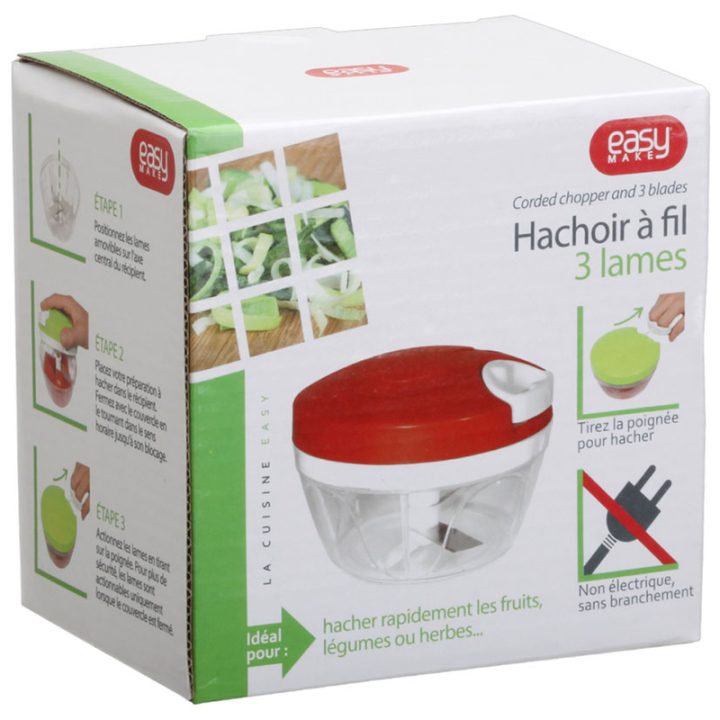 Este cortaverduras incorpora un sistema de corte rotativo mediante cuchillas afiladas que se accionan tirando del mango. No necesita electricidad, evitarás olores en las manos y ojos llorosos. Su base es antideslizante para un cómodo manejo. Tiene una capacidad de 45 cl y se desmonta fácilmente para una fácil limpieza. Viene presentado en una caja y se sirve en colores surtidos.